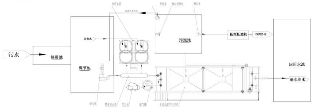 工作原理:在一定條件下,將大量空氣溶于水中,形成溶氣水,作為工作介質,通過釋放器驟然減壓快速釋放,產生大量微細氣泡粘附于經過混凝反應后廢水中的“礬花”上使絮體上浮,從而迅速地除去水中的污染物質達到凈水的目的,詳見工藝流程圖。