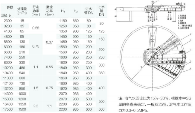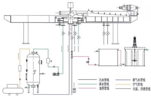 工作原理及構(gòu)造:利用溶氣系統(tǒng)向水中溶入大量的空氣,形成溶氣水,進入待處理水中,減壓釋放后在水中形成大量的微細(xì)氣泡,氣泡與水中 的雜質(zhì)、絮粒相互粘附,形成比重小于水的浮體,從而快速浮出水面,經(jīng)刮渣裝置撇除后,完成固、液兩相分離,使水質(zhì)得到 凈化。主要由池底、撇渣裝置、工作橋與行走裝置、布水布?xì)庋b置、集水裝置、集電裝置組成。