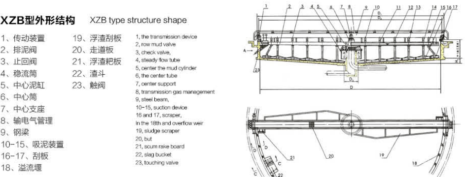 XZB型吸泥機一般用于大型(一般指流量大于500m3/h) 污水處理工程的幅流式沉淀池,特別適用于二沉池池底污 泥的刮集及外排。池形一般采用中心進水、周邊出水、中 心排泥,池底可不設坡度(平底結(jié)構(gòu)),二沉池使用尤為廣 泛。水面浮渣、浮沫等雜物可由浮渣刮集裝置刮排至池外 渣坑或渣斗。靜壓排泥依靠各個管口閥門,調(diào)節(jié)流量流至 中心泥缸直接外排。虹吸排泥主要是利用真空泵抽真空進 行二次虹吸提升排泥力矩變化范圍較大的場合,可采用帶力矩保護裝置的軸裝 式減速機。